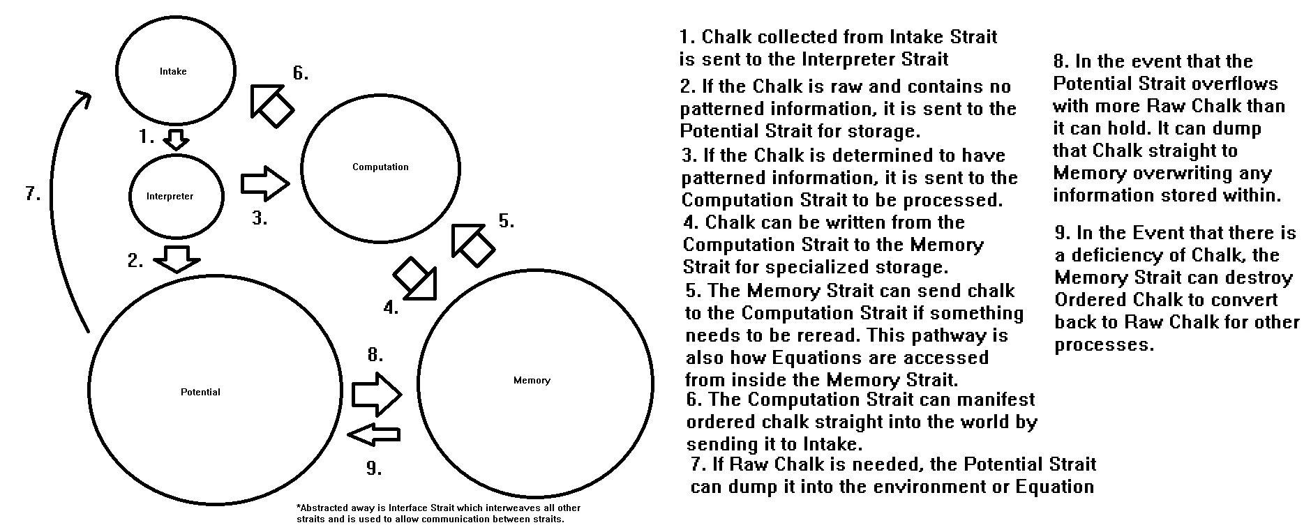 The graphic above depicts the workings of the Five Straits, a critical physiological component of the third kin denizens of the Switchboard. It illustrates the workings of the straits with regards to how they interact with each other, and the emergent functionality that allows the denizens of the Switchboard to act as they do.